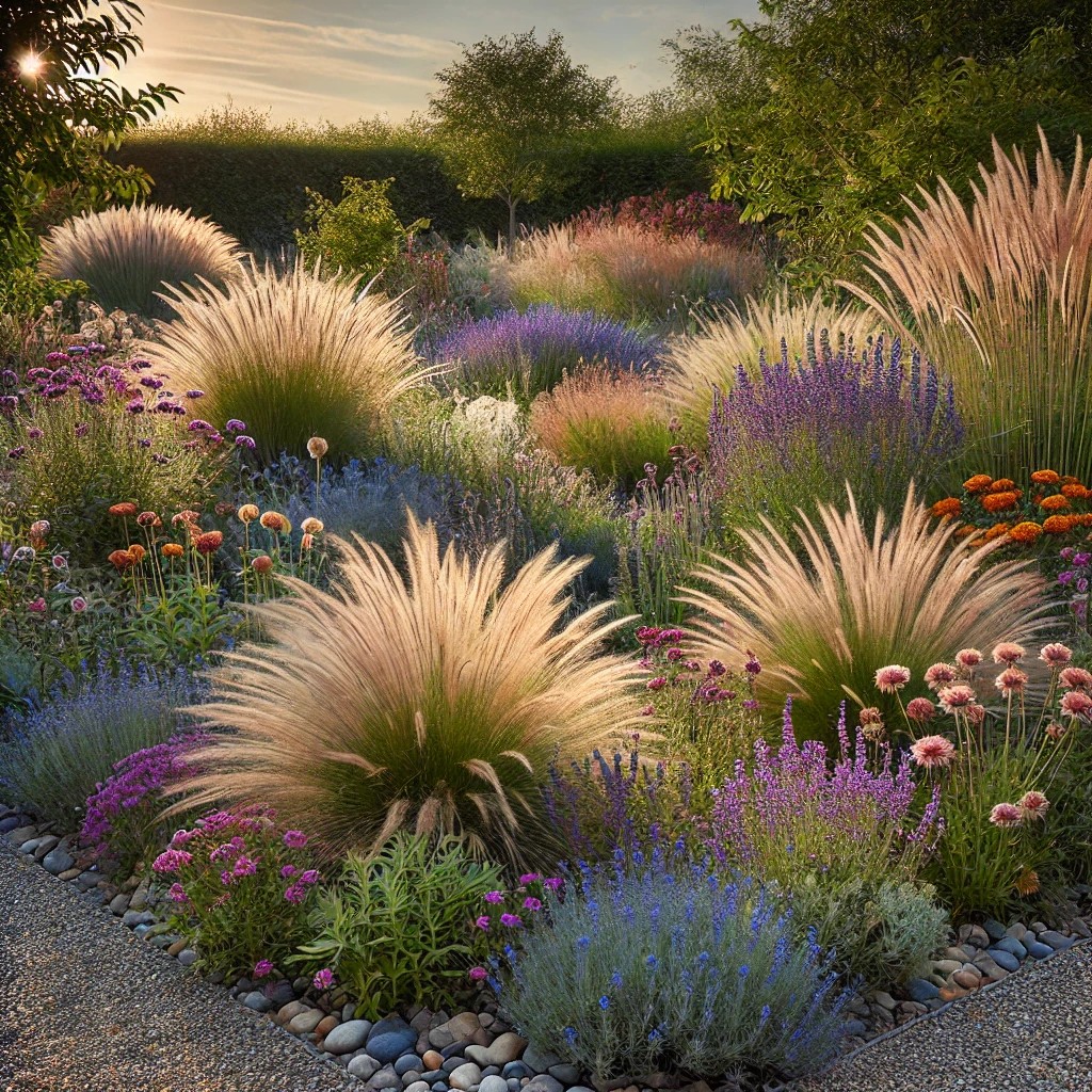 Die Kombination aus eleganter Rose, prächtiger Schwertlilie und Leichtigkeit versprühender Rutenhirse sorgt für Struktur im Beet. Zusammen mit den weiteren Stauden, schaffen die sanften Blütenfarben in Hellgelb, Hellblau, Violett und Weiß eine entspannte, aber gleichzeitig lebendige Atmosphäre.